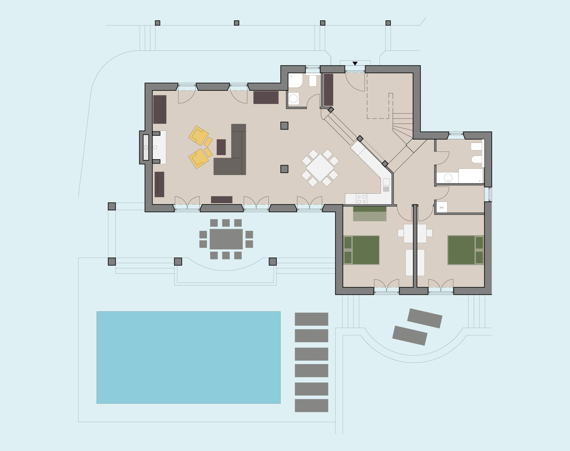 Ein 60 m² großer Pool, 2 Sonnenterrassen, gemütliche Liegestühle sowie ein Holzkohle- und Gasgrill stehen Ihnen im gepflegten Garten zur Verfügung.